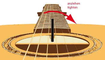 Wooden tuner knobs have a metal sleeve which could loosen. This may lead to difficulty in tuning the affected string and may also cause vibration noise. In this case, it will be necessary to remove the knob from its sleeve. Tune the string down at least one full tone and loosen the screw at the outside of the tuner knob with a suitable screwdriver. Take care, when removing the knob, that the two washers of metal and plastic respectively, remain on the tuner pin. These washers are essential for the proper functioning of the tuner. After removing the tuner knob, separate the metal sleeve, apply a drop of ‘superglue’ and then reassemble the knob and sleeve.